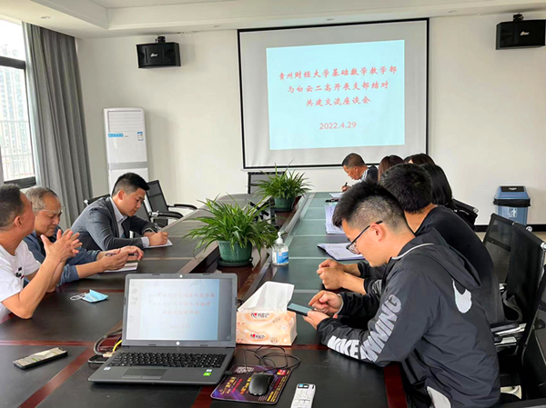 4月29日下午,基础数学教学部教工党支部书记周龙桥、教学部副主任朱晓铭一行到贵阳市白云区第二高级中学开展党支部结对共建交流座谈会。会议由白云二高教务处主任晏勇老师主持。基础数学教学部教工党支部的党员代表,白云二高数学组的党员教师代表参加了本次座谈。