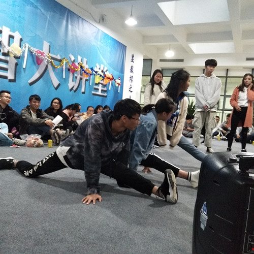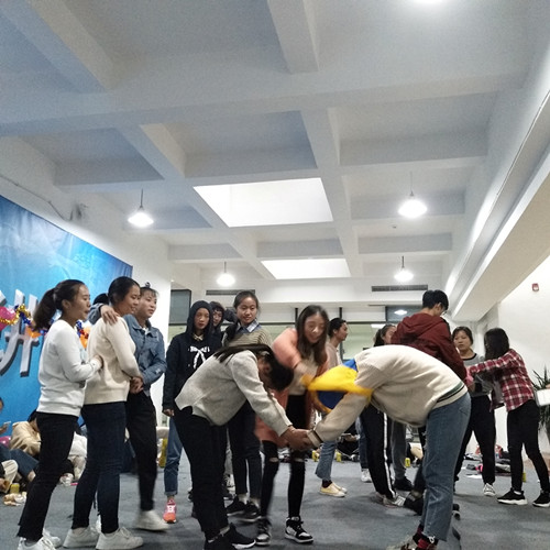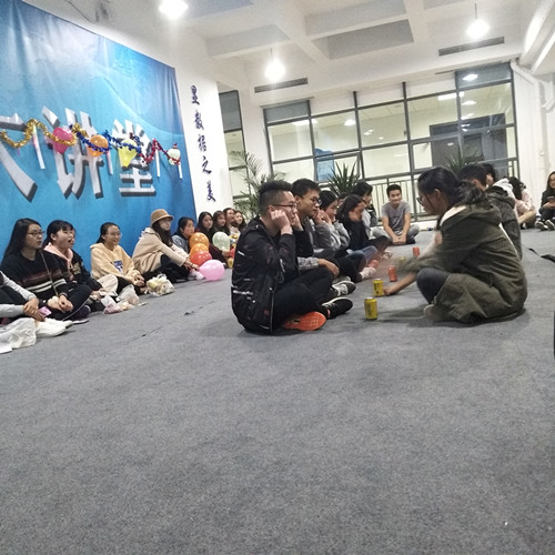 这天下午17:00,活动开始,首先由会长和副会长上台发言。之后,全体成员围坐一圈开始游戏。互怼游戏:每部门派2名部员在限定时间内怼句数多者获胜;集体传递穿T恤游戏:以部门为单位传递穿T恤用时最少的部门获胜;抢瓶子游戏:每部门派2名部员共组成2组,听裁判口令抢到瓶子者获胜。游戏淘汰的人会受到惩罚,游戏获胜的人当场领奖。游戏结束后全体成员进行大合照。