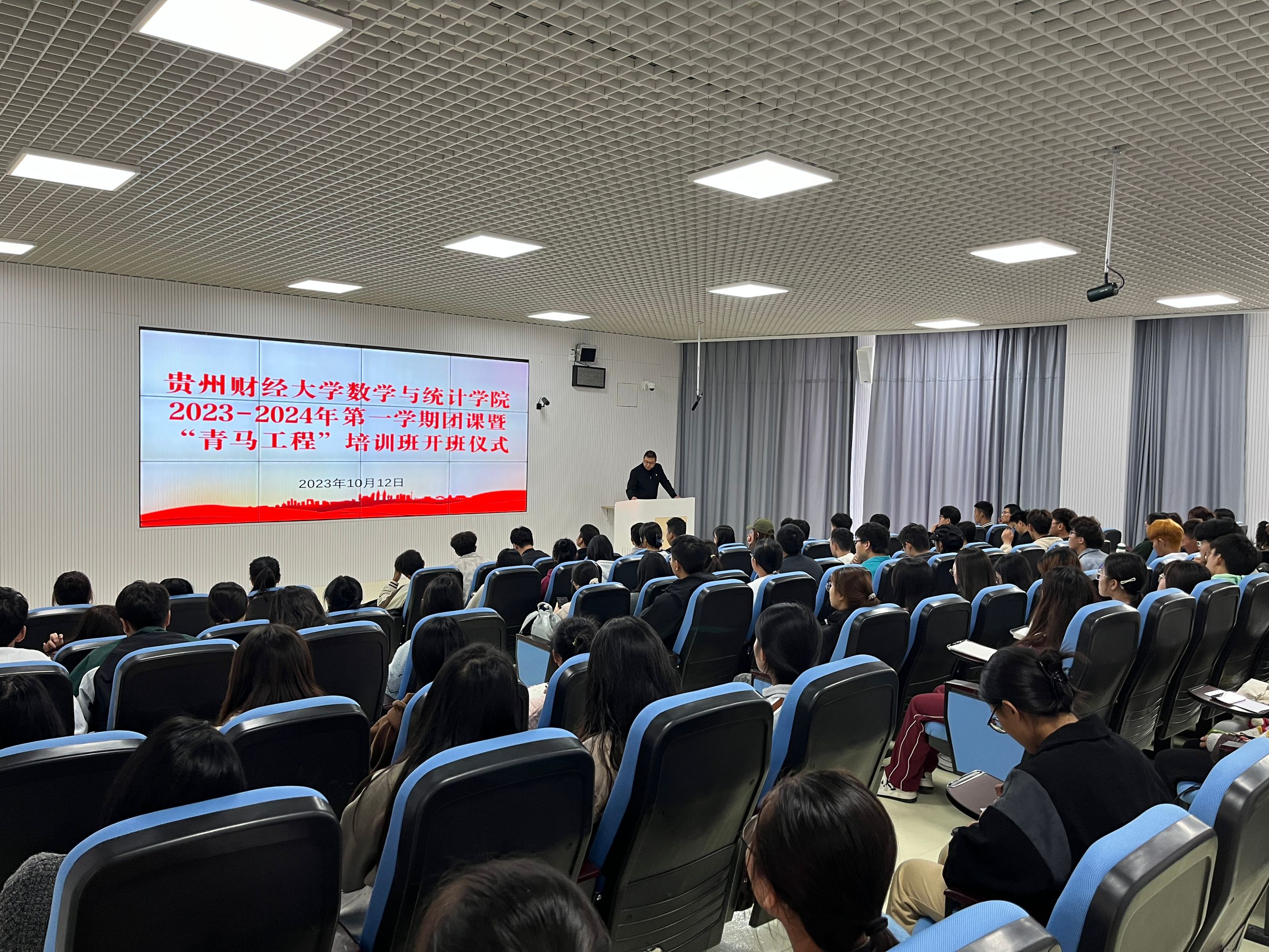 2023年10月12日,2026年国际足联世界杯在花溪校区进学楼102教室举行2023-2024年第一学期团课暨“青马工程”培训班开班仪式暨第一课。公司党委书记虞帆、院团委书记贺婧及各年级团学代表共113位同学参与本次活动。
