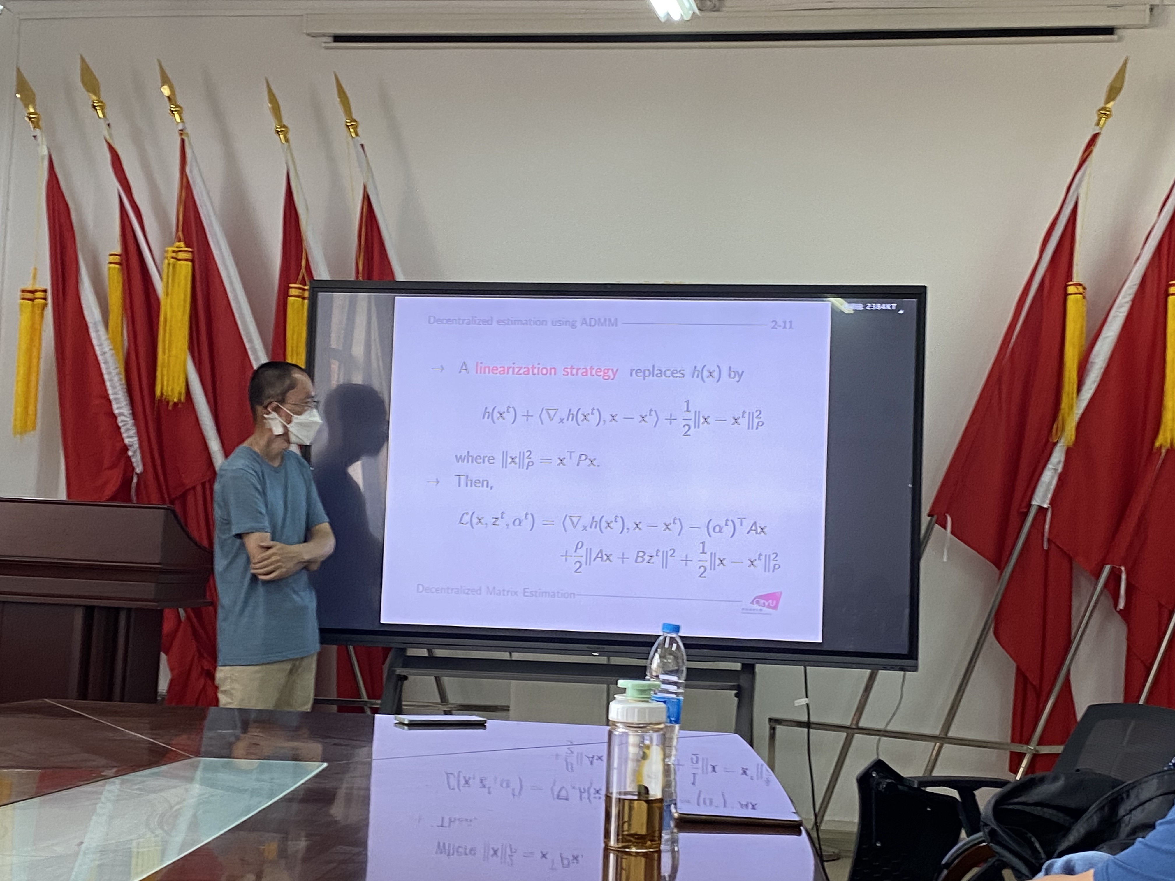 练恒以“基于因子分解的低秩矩阵估计的去中心化ADMM方法”为题,介绍了在分布式环境下,基于凸损失函数和非凸矩阵分解的低秩矩阵恢复问题,以及如何采用线性化去中心化交替方向乘子法(ADMM)计算一致解。练恒还与参会师生进行交流,并就有关问题作了生动而形象的讲解。