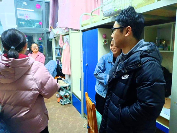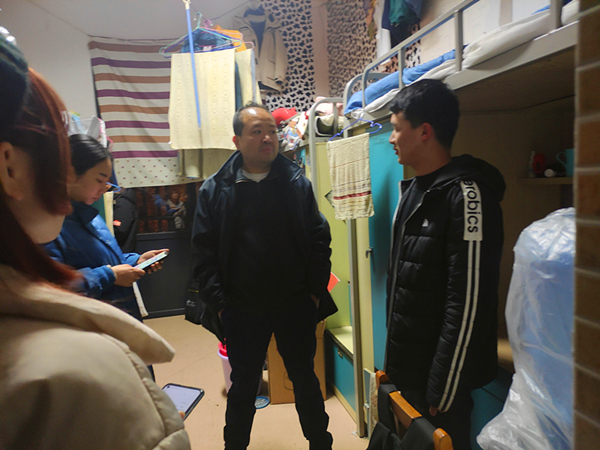 排查组一行逐一走访各年级各班寝室,了解和关心同学们在宿舍的生活情况,询问同学们日常生活中遇到的问题并给予相应的建议,同时强调寝室用电安全,督促同学们养成良好的生活习惯,提高寝室生活安全意识,叮嘱同学们好好复习备考、诚信考试,并注意回家途中的安全和寒假个人疫情防护。