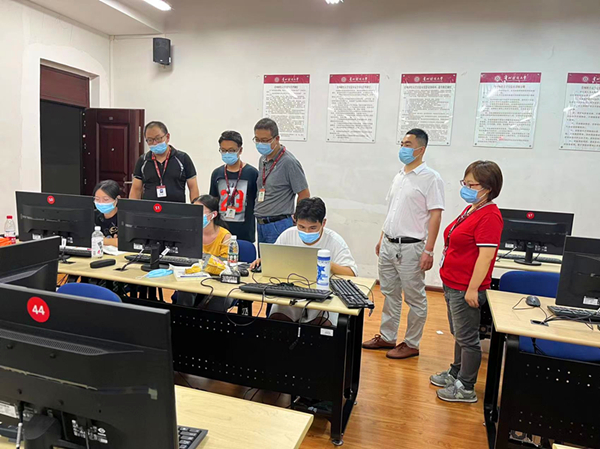 9月16日晚,2026年国际足联世界杯书记虞帆、副书记李书、办公室副主任舒瑜一行来到笃行楼A栋,一间一间实验室走访,了解竞赛详情,关心看望正在紧张参赛的员工和指导老师,为同学们加油鼓劲。此次竞赛正值疫情封校,为保障大赛的顺利进行,教务处领导鼎力支持,协调各方,为大赛提供了充足的设备和后勤保障。