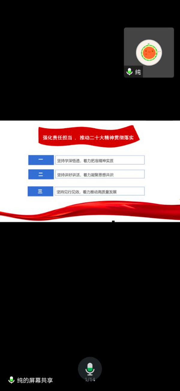 11月22日,​公司党委副处级专职组织员余纯采用线上线下的结合方式,在志学楼304会议室、腾讯会议为联系的党支部和班级宣讲党的二十大精神。公司本科生第二党支部全体党员、2021级统计学班、2022级统计学1班、统计学2班全体员工参加。