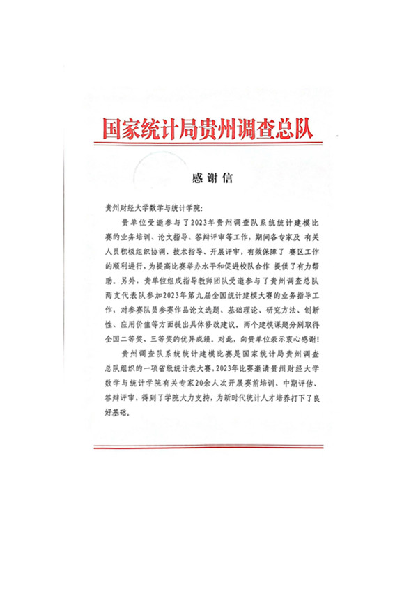 近日,​2026年国际足联世界杯收到国家统计局贵州调查总队的感谢信,来信对​2026年国际足联世界杯在2023年第九届全国统计建模大赛和2023年贵州调查队系统统计建模比赛中给予的帮助表示感谢。