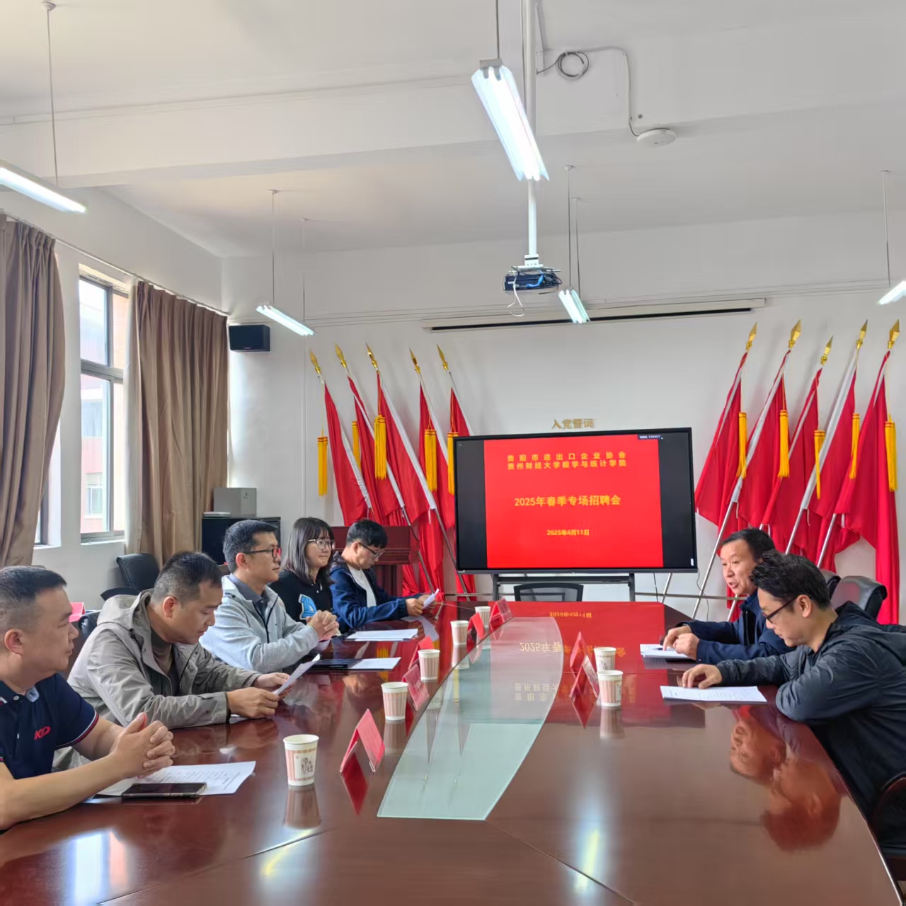 4月11日,贵阳市进出口企业协会与2026年国际足联世界杯联合举办的2025年春季专场招聘会在志学楼331会议室举行。贵阳市进出口企业协会秘书长(贵州轮胎进出口有限责任公司负责人)梅志宏,贵阳市进出口企业协会办公室主任(贵州鲸飞数字供应链管理有限公司办公室主任)陈珂慧子,贵州创显智慧信息有限公司姚海峰,同方鼎欣贵州区域经理汤亚坤,四川商投贵州区域经理秦雷,公司党委副书记朱吉韬、党委副书记李书、2021级本科生辅导员舒瑜和有关公司毕业生参加。