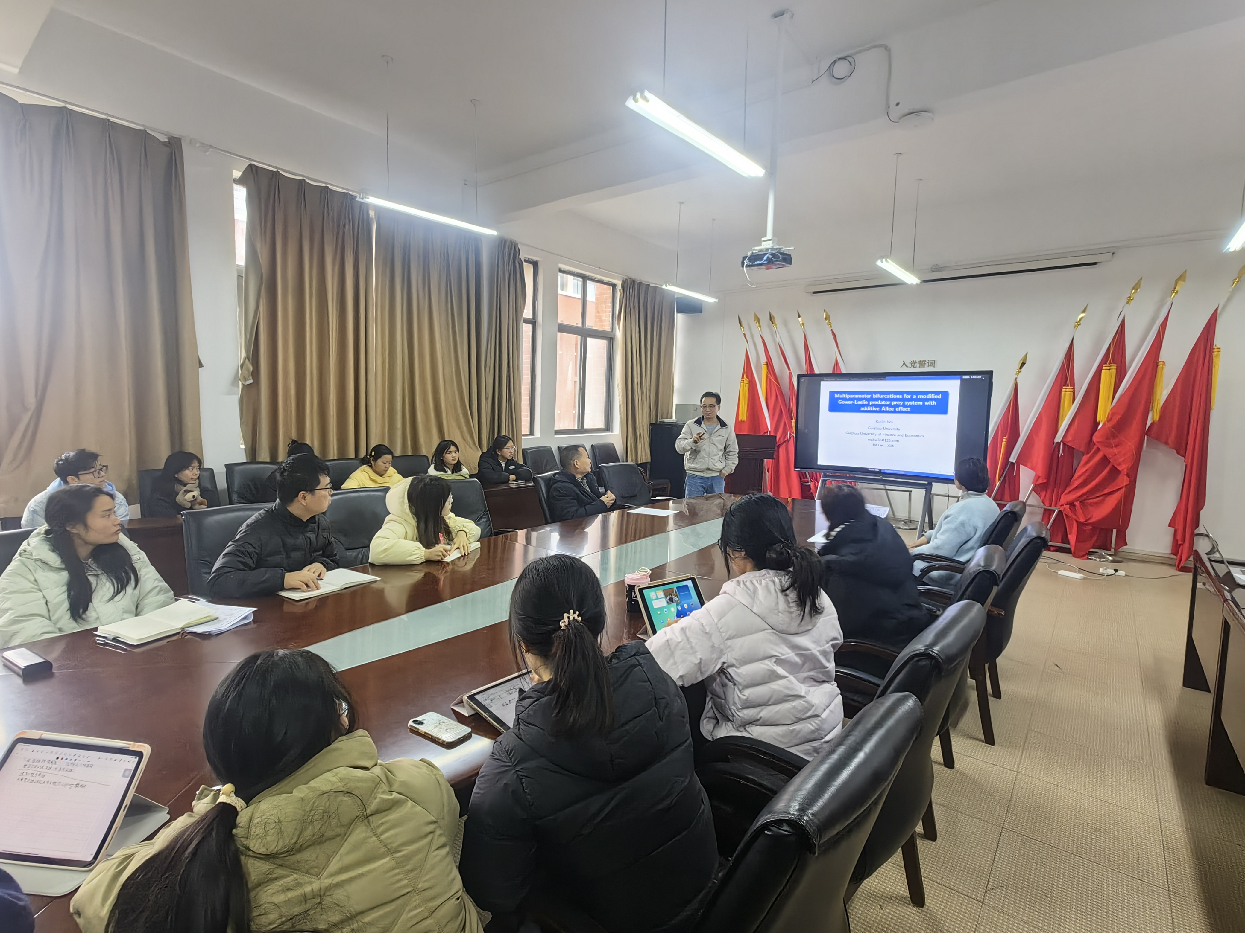 吴奎霖以“Multiparameter bifurcations for a modified Gower-Leslie predator-prey system with additive Allee effect”为主题,探讨了Allee效应对种群动态行为的影响,并详细介绍了一类带有 Holling I 型功能性反应和加性Allee 效应食饵的修正 Leslie-Gower 型捕食—被捕食系统模型。
