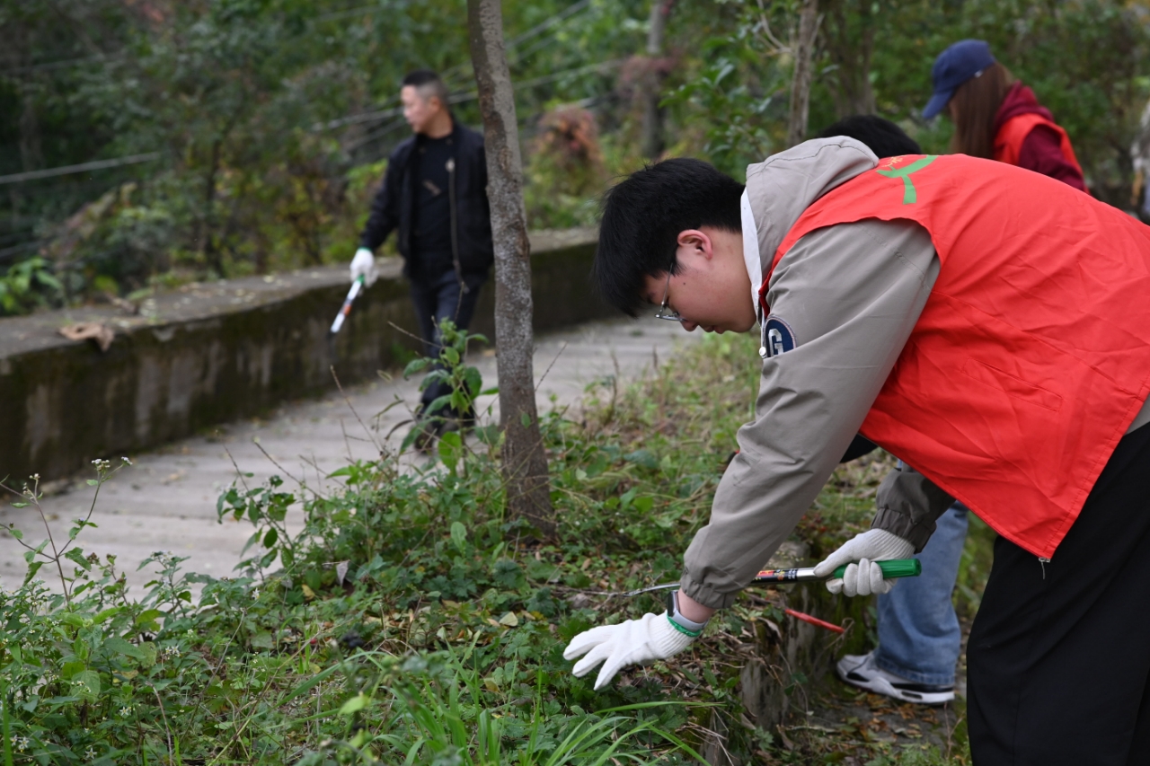 活动中,志愿者们手持清洁工具,深入乡村街道、绿化带等公共区域,重点清扫路面落叶、捡拾隐匿在草丛中的塑料袋、烟头等垃圾,并仔细清理了多个卫生死角。同学们分工协作,配合默契,有的仔细清扫路面,有的专注清理绿化带内的杂物,有的负责将收集的垃圾集中清运。经过一下午辛勤劳动,村寨环境变得更加整洁靓丽。
