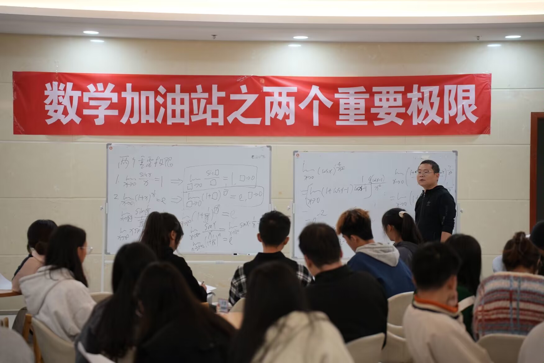 黄鹏老师用一个极限题目来引起同学们的思考,然后再详细地讲解知识点。为了让同学们能更好的理解,黄鹏老师给同学们细细的讲解了几个例题。同学们都有认真的听讲,跟着老师的思路解题。通过这次数学加油站活动同学们又收获了新的的知识,又多了一些解题的技巧和思路。〝两个重要的极限”教学按照黄鹏老师这样整体性、一致性的方式进行,员工才能学得更透彻,学得更明自,真正达到理解,掌握学习方法。